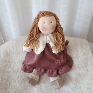 Muñeca con chaleco blanco y vestido burdeo personalizada